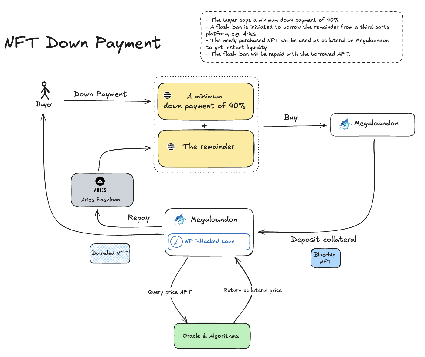 **Example:** A buyer puts down 40% on a Aptos Monkey NFT. The remaining 60% is borrowed via a flash loan from Aries, which is then repaid through an NFT-backed loan on Megaloandon.