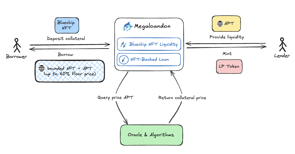 * Borrower deposits NFTs as collateral to borrow APT from pool then Megaloandon mint out mNFTs which the same as bounded NFTs have **the same** **metadata, token ID, non-transferable**.